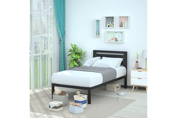 Amazon Basics Industrial Metal Bed Frame with Headboard and Wood Slats