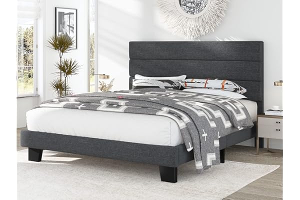 Allewie Queen Size Platform Bed Frame with Fabric Upholstered Headboard and Wooden Slats Support