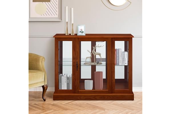 Adjustable Tempered Glass Shelves and Mirrored Back Panel, Walnut