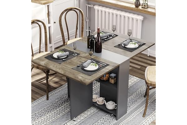 Drop Leaf Dining Table with 6 Wheels and 2-Layer Storage Shelf, Space Saving Dining Table for Small Spaces, Chestnut and Gray