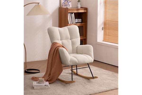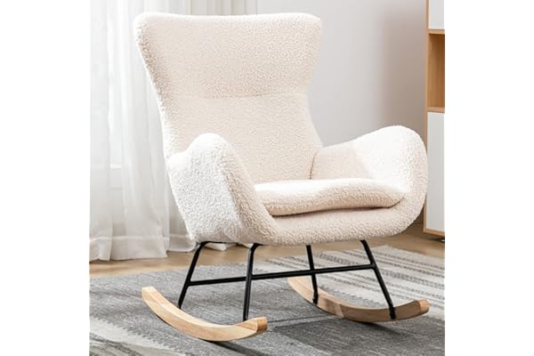 Rocker Armchair with Solid Wood Legs,Glider Chair Nursery with High Backrest for Living Room Apartment(Teddy Fabric,Ivory)