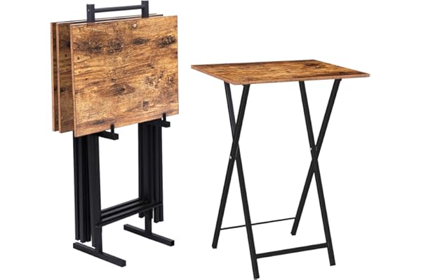 Set of 4 TV Trays with Storage Rack, Industrial Side Table for Eating at Couch, Foldable Snack Table for Small Space, Easy Assembly, Rustic Brown and Black BF50BZ01