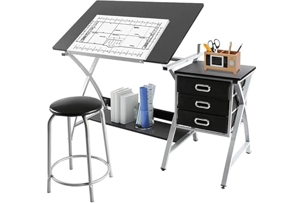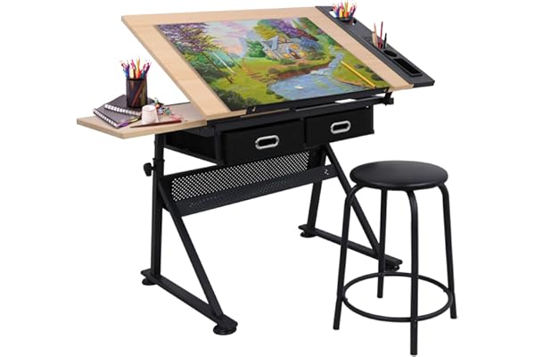 ZENY Drafting Table and Stool Set Tabletop Tilted Drawing Table Drafting Desk w/Drawers Artists Workstation