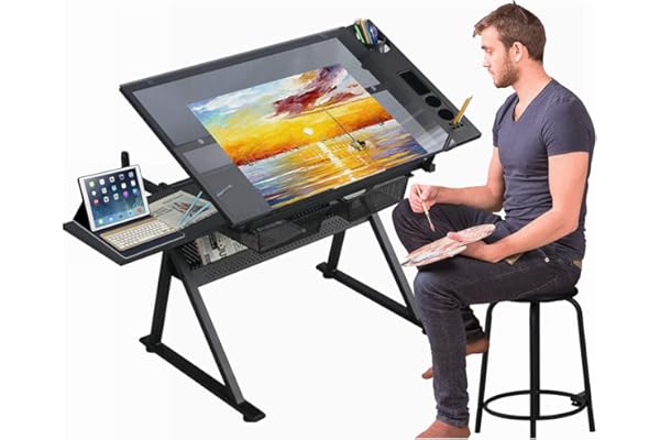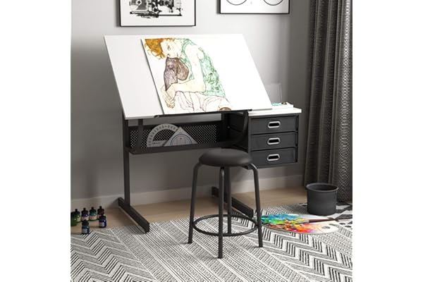 Drawing Table for Artists/Adults, Art Desk w/Stool and 3 Slide Drawers, Painting Studio Design Work Station, Adjustable Tabletop