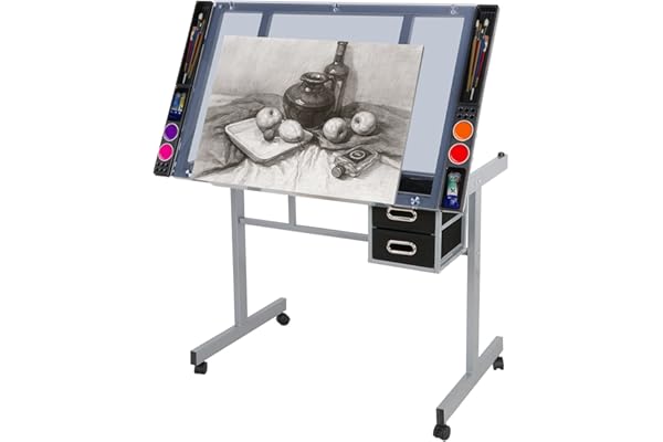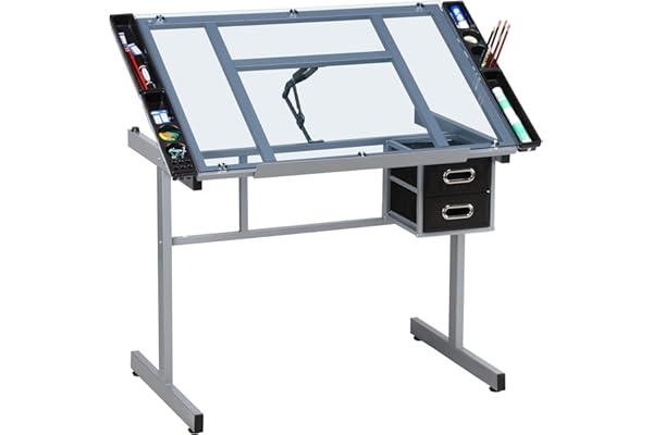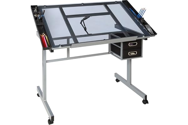 ZENY Glass Top Adjustable Drawing Desk Craft Station Drafting Table Tempered Glass Top Art Craft Desk w/2 Slide Drawers and Wheels