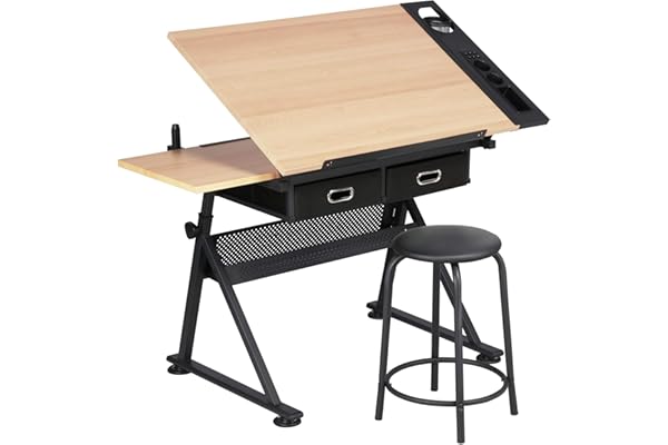 Yaheetech Height Adjustable Drafting Table Drawing Table Artist Desk Tilting Tabletop Art Craft Desk Watercolor Paintings Sketching Work Station w/2 Storage Drawers and Stool for Home Office