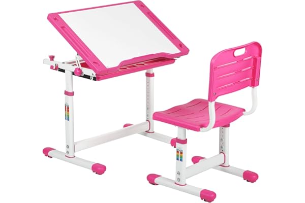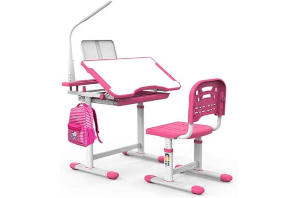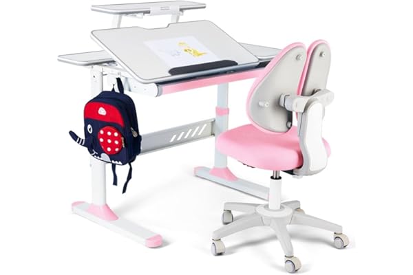 Children Writing Student Desk Drafting Tables with Tilt Desktop Height Adjustable Kid Desk Chair with Storage Drawers (Pink)