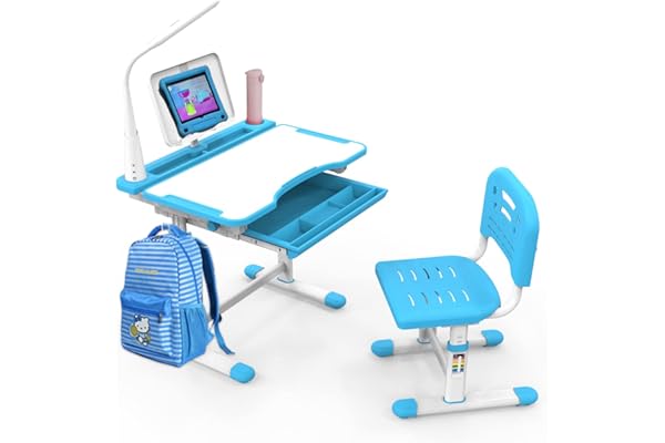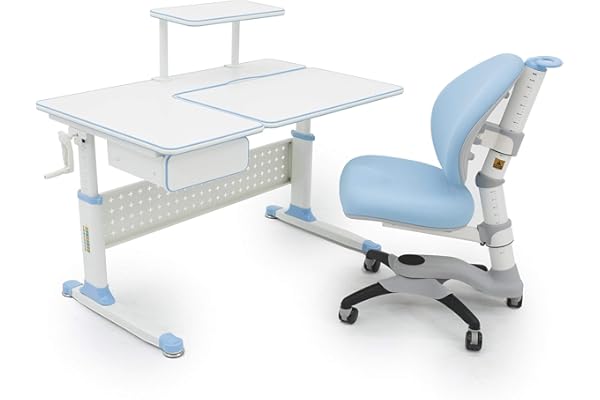 Kids Desk with Storage, Height Adjustable Kids Study Desk and Chair Set 40 Degree Tiltable Desktop Desk for Kids,Sky Blue
