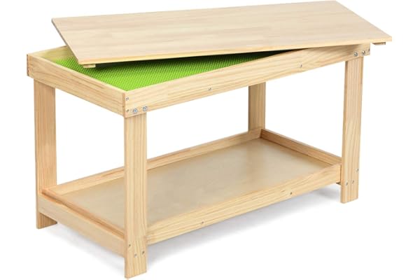 Building Block Table w/Board for Bricks Crafts Arts Draw, Children Solid Wood Play Table Desk for Playroom, Preschool Toddler Boys & Girls Gift (Natural)