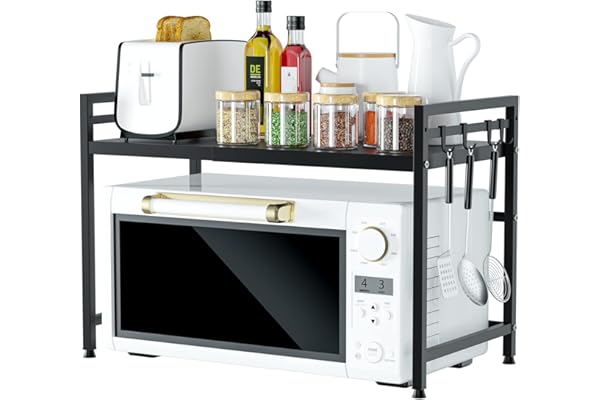 Adjustable Microwave/Toaster Shelf Heavy Duty Stand Kitchen Counter Top Organizer, 2-Tier with 3 Hooks, 160lbs Weight Capacity