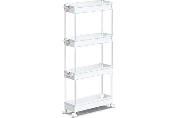 4 Tier Bathroom Organizer Mobile Shelving Unit, Rolling Utility Cart Slide Out Organizer for Kitchen, Bathroom, Laundry, Narrow Places, White