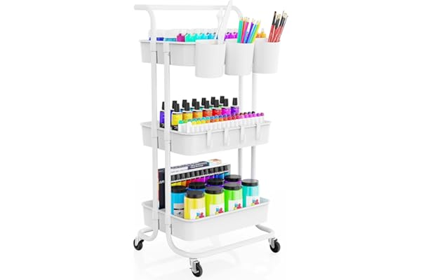 Metal Utility Cart with Lockable Wheels, Storage Craft Art Cart Trolley Organizer Serving Cart Easy Assembly for Office, Bathroom, Kitchen, Kids' Room, Classroom (White)