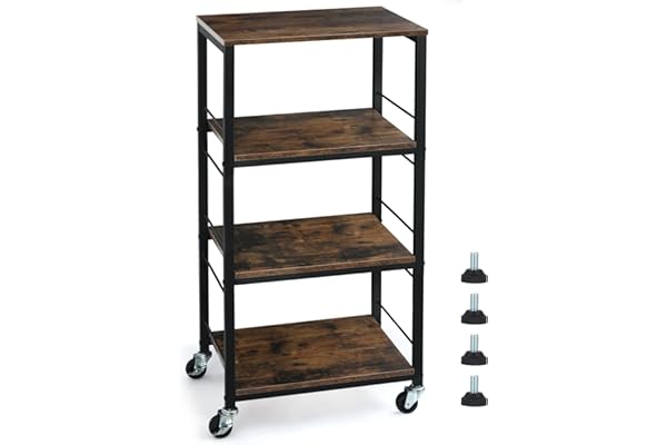 4-Tier Floor Standing Utility Display Kitchen Wire Wood Shelf Rack for Garage Bathroom Living Room (Dark Brown_ Wood Tier)