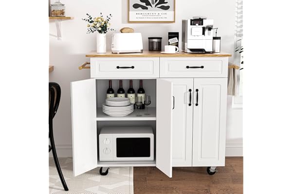 Rolling Kitchen Island with 2 Drawers and 2 Storage Cabinets, White Kitchen Island with Wooden Countertop, Towel Racks, Adjustable Shelves, 45 L x 17.1 W x 36 H
