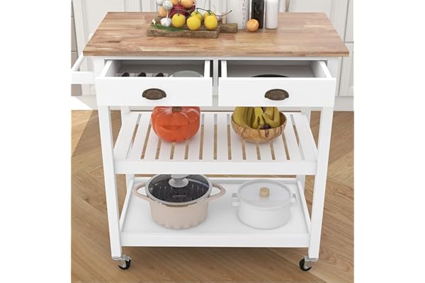 Portable Kitchen Island Wood Top Kitchen Trolley with Drawers and Two-Tier Open Shelf, Towel Rack, White