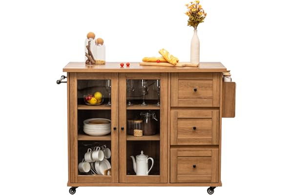 Rolling Kitchen Island with Drawers, Storage Cabinet with Large Tempered Glass Door,Towel Rack and Spice Rack,Lockable Casters, Rubber Wood Countertop,Serving Cart