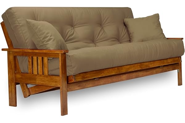 Full Size Futon Frame with Mattress Included (8 Inch Thick Mattress, Twill Khaki Color), More Colors & Larger Queen, Heavy Duty Wood, Popular Sofa Bed Choice