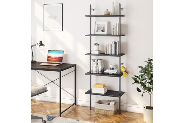 Bestier 70" Ladder Shelf Wall Mounted Industrial 5 Tier Bookshelf Plant Flower Shelf with Round Metal Tube 2 Hooks for Wall Storage Display in Home Office