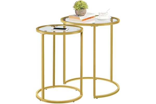 Set of 2 Circular Modern End Tables w/Metal Frame & Tempered Glass Top & Protective Foot Pads for Small Space Living Room Bedroom Office