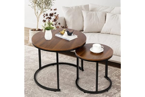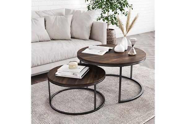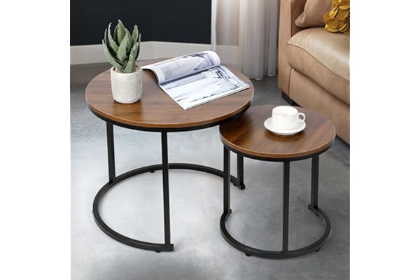 Small Round Coffee Table Set of 2, Center Table with Solid Wood Grain Table Top and Sturdy Metal Frame, Nesting Tables for Small Spaces, Easy to Assemble (Walnut)
