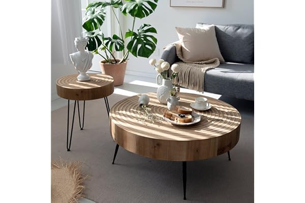 Nesting Table Round Natural Finish with Handcrafted Wood Ring Motif, French Country Decor, Round