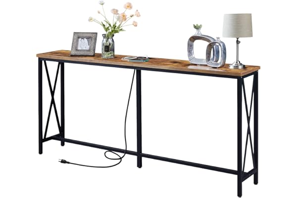 SUPERJARE 70.9 Inch Console Table with 2 Outlet and 2 USB Ports, Extra Long Entryway Table with Metal Frame and X-Shaped Design, Narrow Sofa Table for Living Room and Hallway