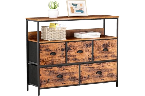 TV Stand Console Table with Shelves, Dresser with 5 Fabric Drawers Closet Storage Organizer for Bedroom/Living Room/Entryway/Hallway, Rustic Brown