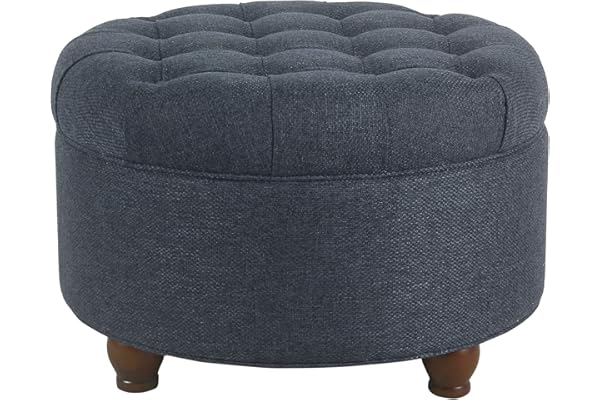 Large Button Tufted Woven Round Storage Ottoman | Ottoman with Storage for Living Room & Bedroom (Navy Woven)