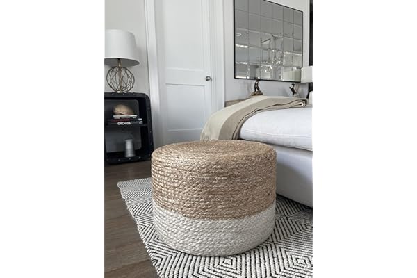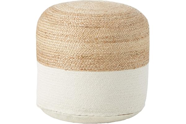 100% Jute Braided Footrest Stool Hand Knitted Traditional Cord Boho Pouffe for Living Room, Bedroom, Nursery, Patio, Lounge Colorblock - Natural Ivory (18”x18”x12”)