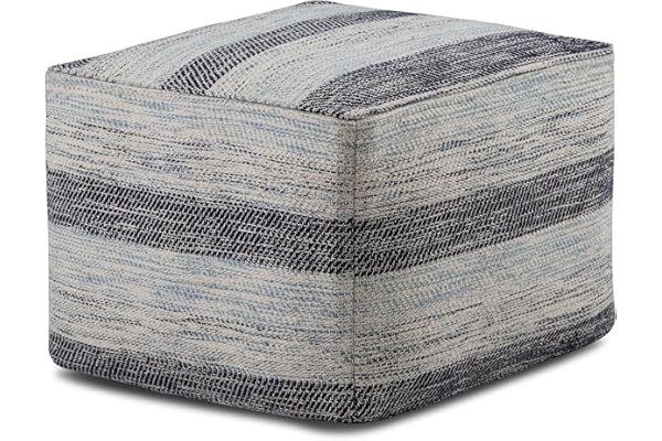 Footstool, Upholstered in Patterned Blue Melange Hand Woven Cotton, for the Living Room, Bedroom and Kids Room, Transitional, Modern