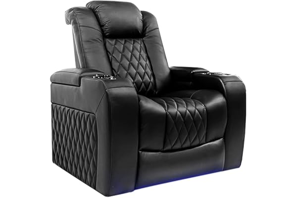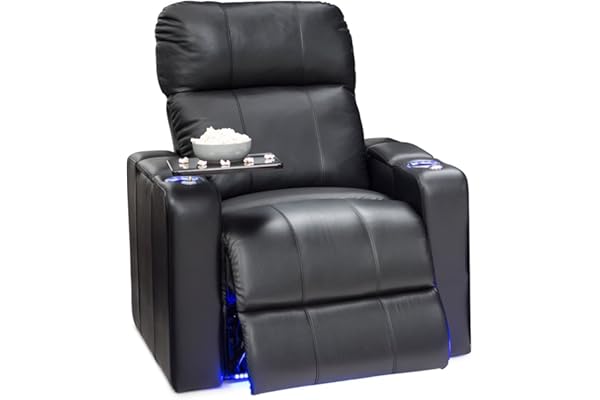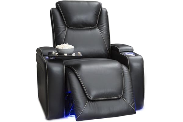 Home Theater Seating - Top Grain Leather - Power Recline - Powered Headrest and Lumbar Support - Arm Storage - USB Charging - Cup Holders - Single Recliner, Black