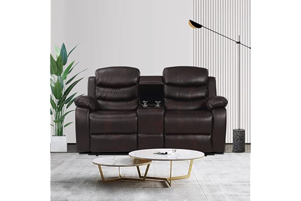 Leiln.z 2-Seater Dark Brown PU Double Reclining Sofa with Storage Console and 2 Plastic Cup Holders Theater Seating Furniture Sofa Bed(Dark Brown)