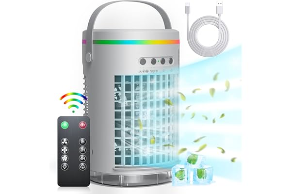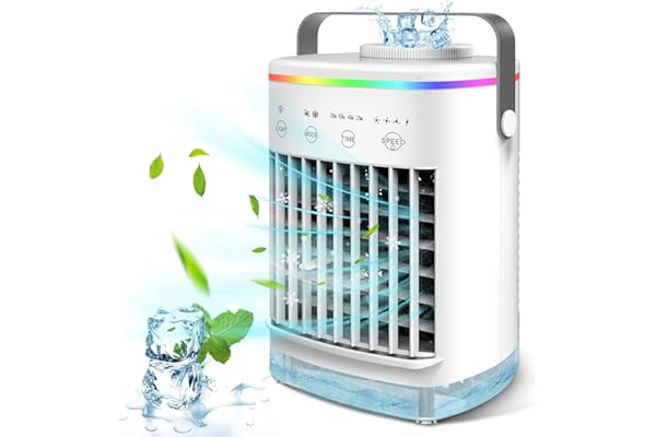 Desktop Cooling Fan with Double Water Tank, 4 Speeds, 8H Timer, 7 Colors, Portable Air Conditioner Fan, Portable Camping Fan with Handle for Home Bedroom Office