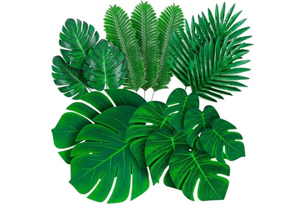 Decopom Palm Leaves Artificial Tropical Monstera-84Pcs 6 Kinds Large Small Green Fake Palm Leaf with Stems for Safari Jungle Hawaiian Luau Party Table Decoration Wedding Birthday Theme Party