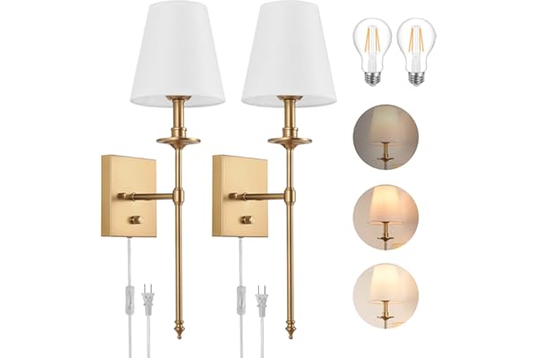ENCOMLI Plug in Wall Sconces White Fabric Shade, Wall Lamp with 6FT Plug in Cord, Plug in Wall Light Bathroom Vanity Light Fixture, LED Bulbs Included, Antique Brass