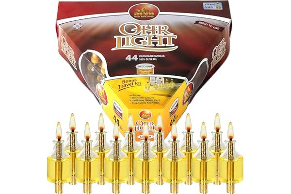 Hanukkah Ohr Lights - 100% Olive Oil with Cotton Wick in Glass Cup - Medium Size, 44 per Pack, Burns Approx. 2 1/2 Hrs