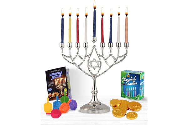 Full Size 9" Menorah, 44 Colored Candles, Complete Chanukah Guide Booklet, 6 Colored Dreidels, Sack of Milk Belgian Hanukkah Coins Gelt - All Essentials in 1 Box by Zion Judaica