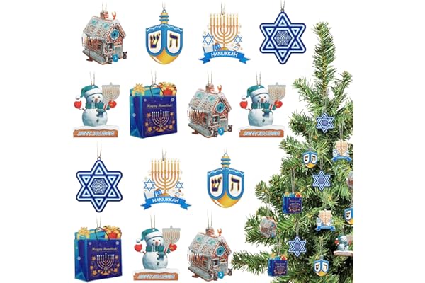 Hanukkah Ornaments Wooden Chanukah Jewish Dreidel Jewish Menorah Hanukkah 6-Pointed Star Happy Hanukkah Present Bag Ornaments for Holiday Christmas Tree Decors (Chic Style,24 Pieces)