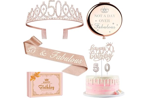 Including Not a Day Over Fabulous Compact Mirror, 50th Birthday Crown/Tiara, Sash, Cake Topper and Candles, Rose Gold 50th Birthday Decorations Women