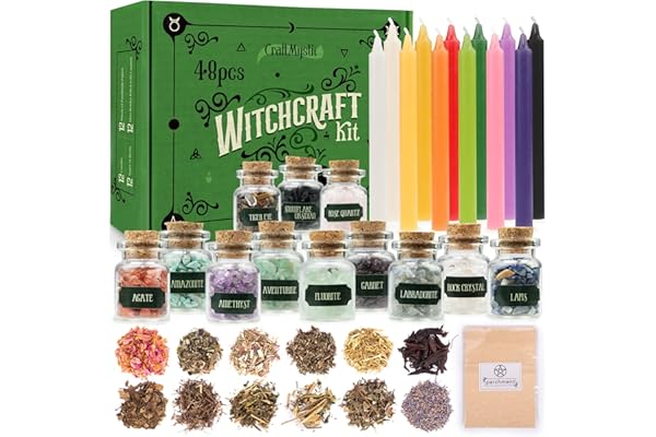 Beginner Witch Starter Kit Crystals Jars Dried Herbs and Colored Candles for Witches Pagan Altar Decor - Wiccan Supplies and Tools Box Witchy Gifts Stuff
