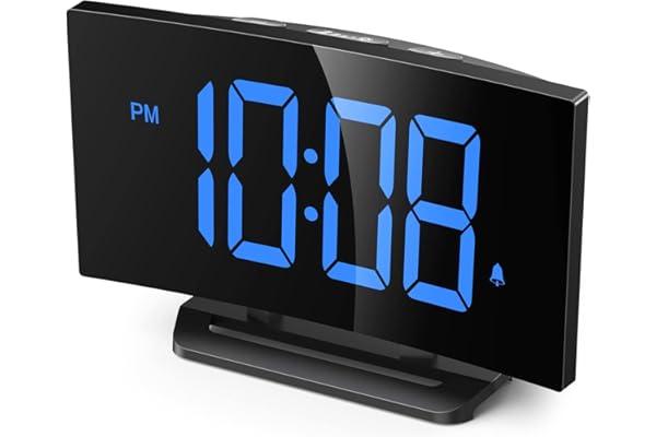 Digital Clock with Modern Curved Design, Conspicuous Blue LED Numbers, 6 Levels Brightness, 2 Volume, 3 Alarm Tones, Snooze, Power-Off Memory, 12/24H, Bedside Clock