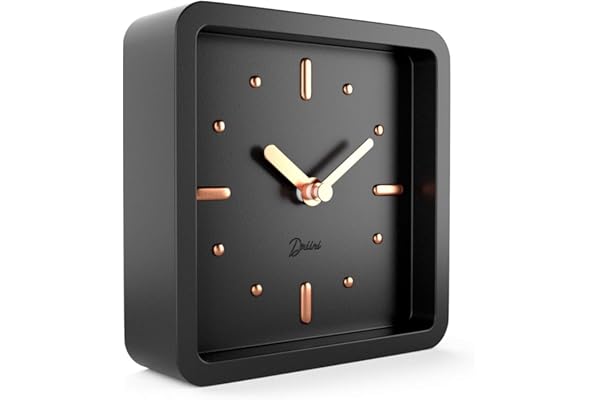 Driini Modern Mid Century Desk and Table Analog Clock (Black Rose Gold) - Battery Operated with Silent Sweep Movement