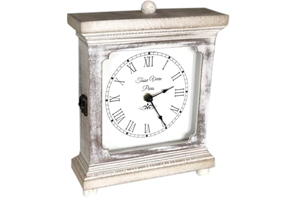 Tasse Verre Rustic Shelf Clock (Quiet) For Bedroom Table Or Desk 9"x7" Farmhouse Decor Distressed White Washed Wood Silent
