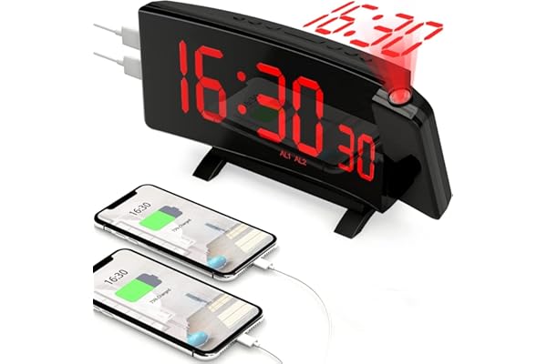 LED Digital Clock Projection on Ceiling Wall with USB Phone Charging,Battery Backup,180°Projector& Dimmer,12/24H,DST,Snooze,Dual Loud Bedside Clock for Heavy Sleeper