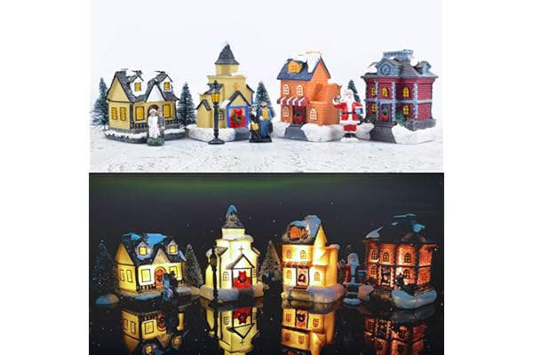 LED Lighted Christmas Village Houses with Figurines, Christmas Village Collection Indoor Room Decor - Collectible Buildings (12 PCS)