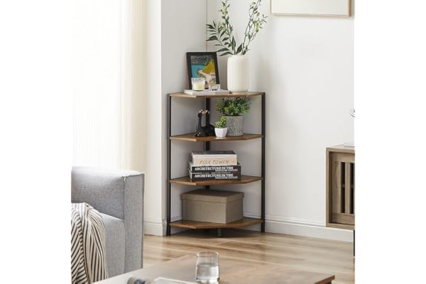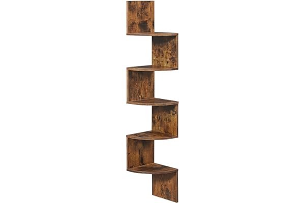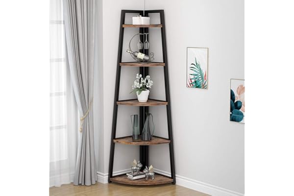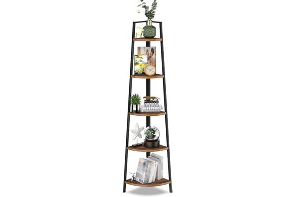 5 Tier Rustic Corner Bookshelf Bookcase Industrial Corner Ladder Shelf Plant Stand for Living Room, Kitchen, Home Office (Brown)