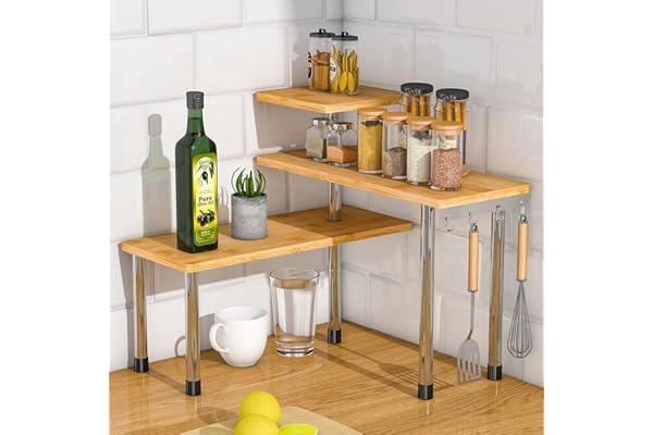 3 Tier Bathroom Storage Display Counter Shelves Bamboo Spice Rack Desk Bookshelf with Hooks