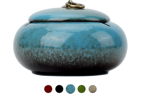 Large Size Color Glaze Cigarette Ashtray Windproof and Rainproof Outdoor Ceramic Ashtray Travel Portable Ash Tray with Metal Lifting Ring Lid Decorative Ashtray (Blue)