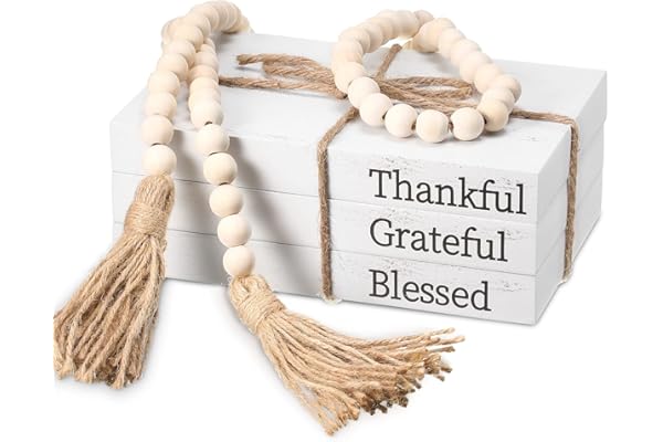 3 Pieces Decorative White Books Hardcover Faux Farmhouse Stacked Books Decorative Display Books for Coffee Tables Shelves with Wood Bead Tassels 58 Inch (Thankful, Grateful, Blessed)