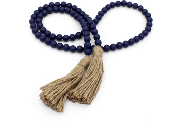 Wood Beads Garland with Tassels Farmhouse Rustic Wooden Prayer Bead String Wall Hanging Accent for Home Festival Decor. Navy Blue